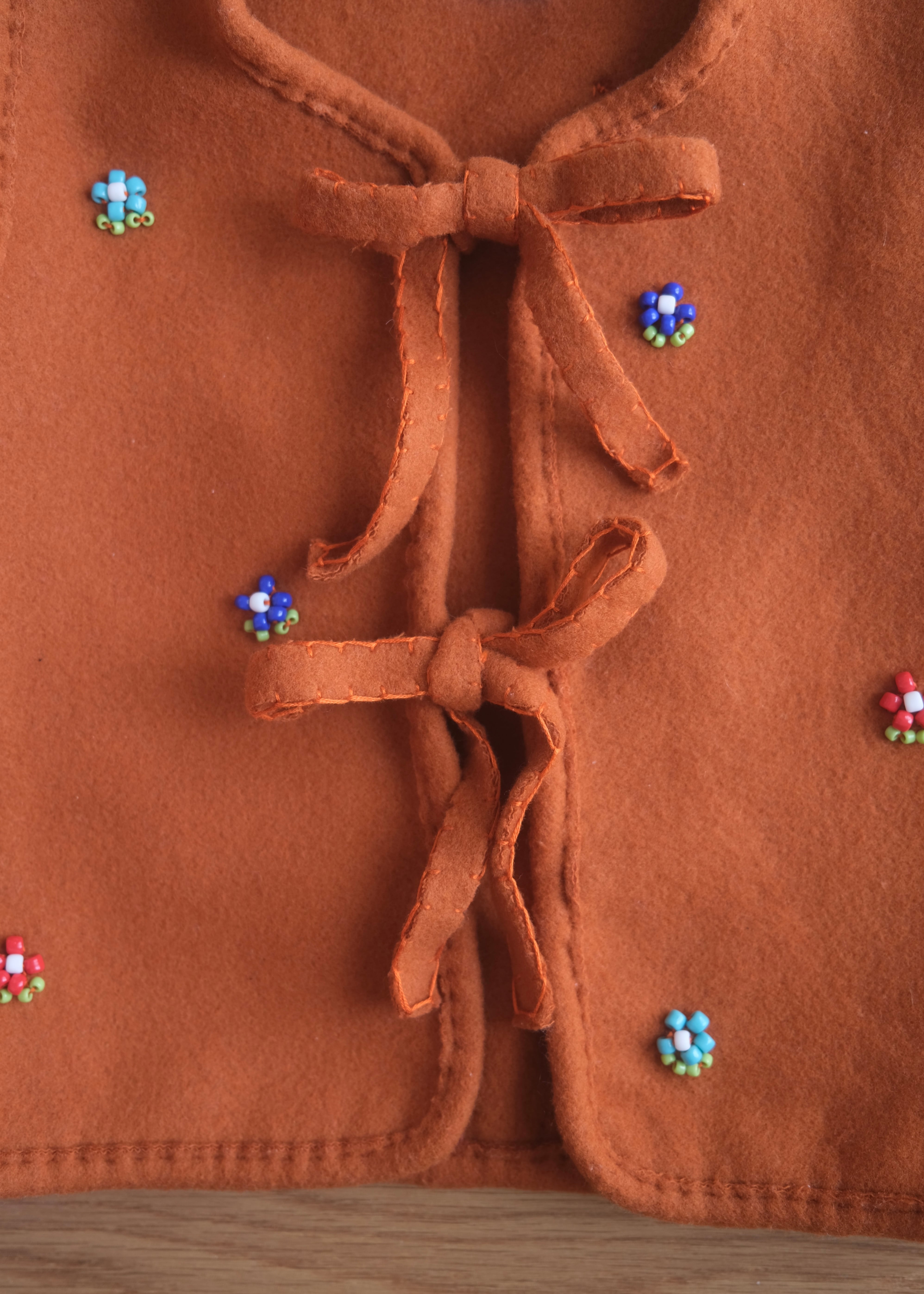お花のビーズモチーフがポイントで、デニムやワンピース、スウェットの上に重ねてカジュアルに着て頂いてもおしゃれです。